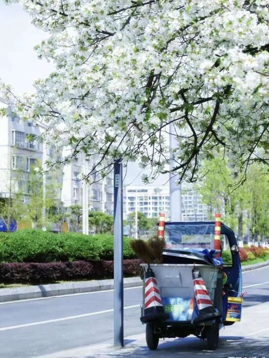 凤凰大道、君平大道等核心区域,我们延续“落叶缓扫”精细化管理模式,环卫工人化身“景观护理员”,只做垃圾捡拾、花木呵护,保留草坪与绿化带的自然野趣,让干净整洁与春日诗意并存,市民随手一拍都是美景。
