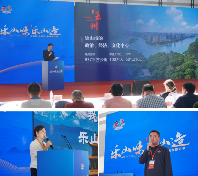 乐山市商务局四级调研员罗卫东登台致辞并做现场推介。为现场观众展示了乐山在历史、文化、风景、产业得天独厚的发展潜力,和乐山美食在特色味道背后的文化故事与匠心传承。从乐山大佛到峨眉山,从跷脚牛肉到钵钵鸡,从李白到苏东坡,从乐山机场到新兴产业,乐山正以开放的姿态昂扬向前,拥抱未来。
