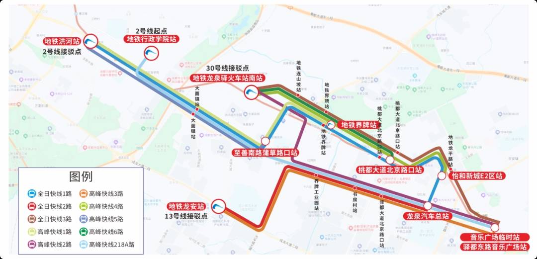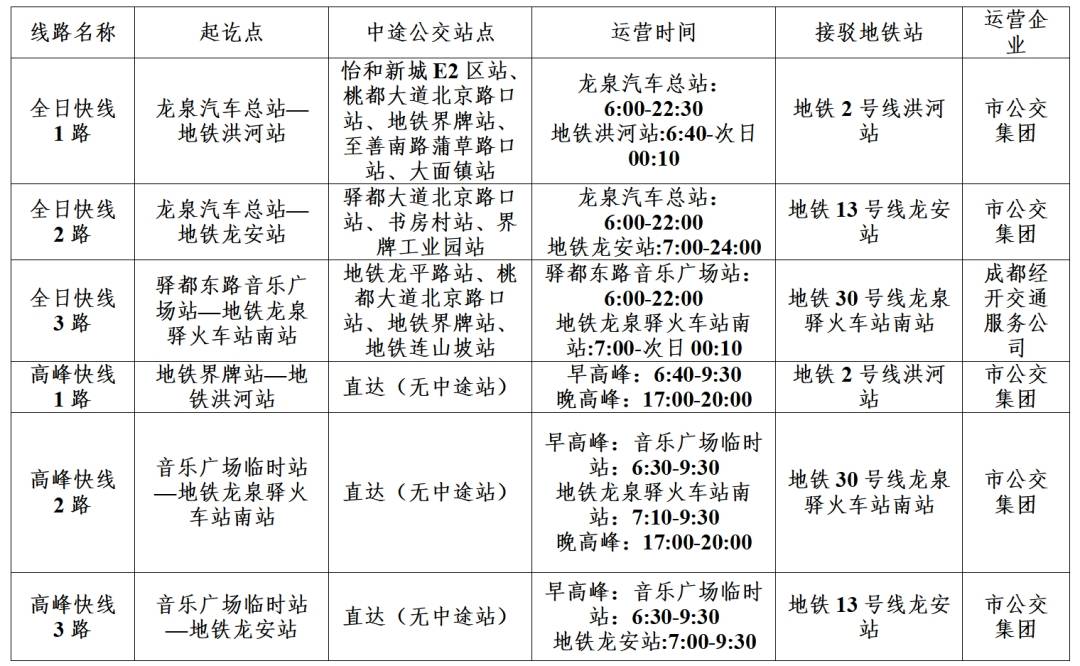 在地铁2号线东段暂停运营期间,成都将在暂停运营的6个地铁站点周边新开通10条公交快线,包含3条全日快线和7条高峰快线,接驳地铁2号线洪河站、地铁13号线龙安站和地铁30号线龙泉驿火车站南站等站点。公交快线将于2025年12月16日至19日试运行,2025年12月20日起正式运行。同时,龙泉驿区还将按需优化调整、提频加密区内12条既有常规公交线路,强化与地铁多点接驳,增强停运区段沿途居民出行服务。
