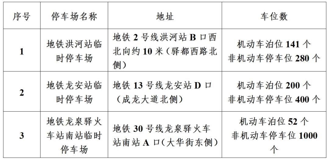 为方便市民自驾换乘地铁,地铁2号线洪河站、地铁30号线龙泉驿火车站南站、地铁13号线龙安站周边新建3个停车场(含393个机动车位与1680个非机动车位),停运期间,非机动车停车免费,机动车停车可享受半价优惠,服务市民停车换乘地铁出行。